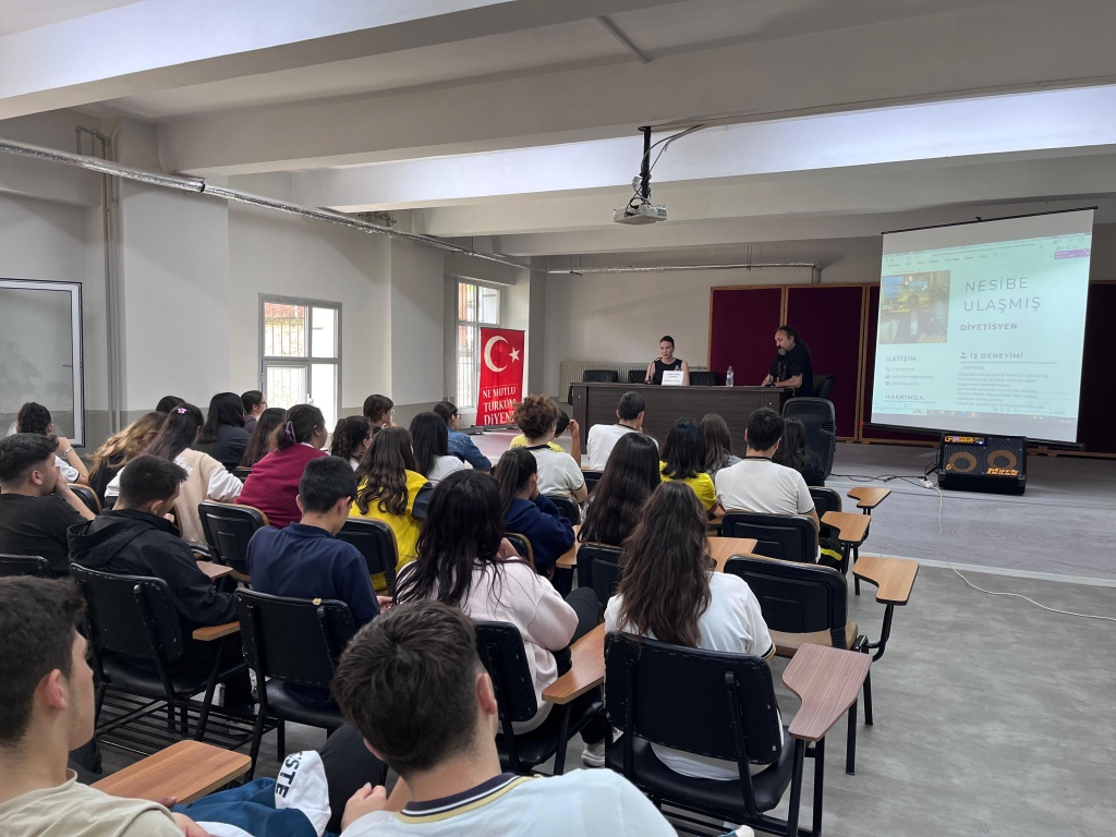 Okulumuz rehberlik servisinin düzenlediği meslek tanıtım günlerinde meslek elemanlarını okulumuza davet ediyoruz. Bugün tanıtılan bölüm “Beslenme ve Diyetetik” bölümüydü. Öğrencilerin merak ettikleri konuları doğrudan sorarak aktif öğrenme sürecine katıldıkları, farkındalık kazandıkları, motivasyon artırdıkları, gerçek hayatla bağ kurdukları, kariyer planlamasına katkı sağladıkları bu günde Diyetisyen Nesibe ULAŞMIŞ’ ı misafir ettik. Okulumuz Mesleki Kariyer Günlerine verdiği katkılardan dolayı teşekkür ederiz.